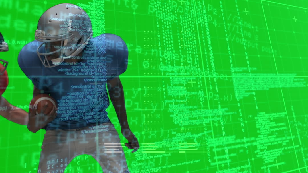 This illustration blends sports and technology concepts, showcasing a football player with a backdrop of complex data and programming elements. The presence of DNA-like structures signifies a connection to physiological data collecting. Suitable for use in contexts related to sports analytics, advancements in athletic performance monitoring, and discussions about technology in sports management.