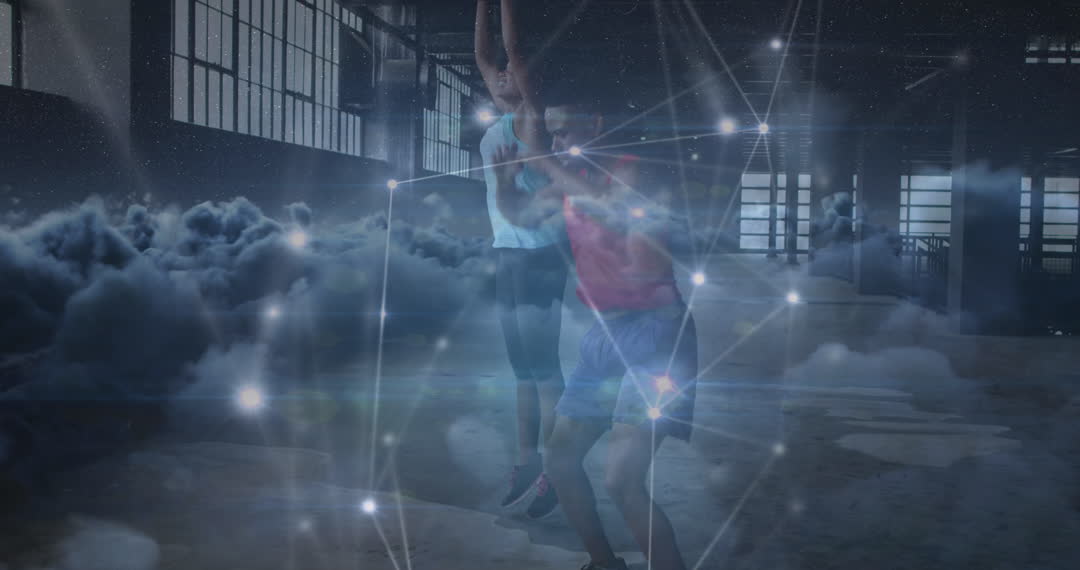 Two young athletes are actively engaging in an indoor athletic routine with a futuristic digital design featuring starry constellations superimposed. This dynamic scenery mixes physical exertion with modern technology, making it ideal for themes in innovation in sports, athletic training enthusiasm, digital interactivity in fitness, and sci-fi inspired wellness activities.