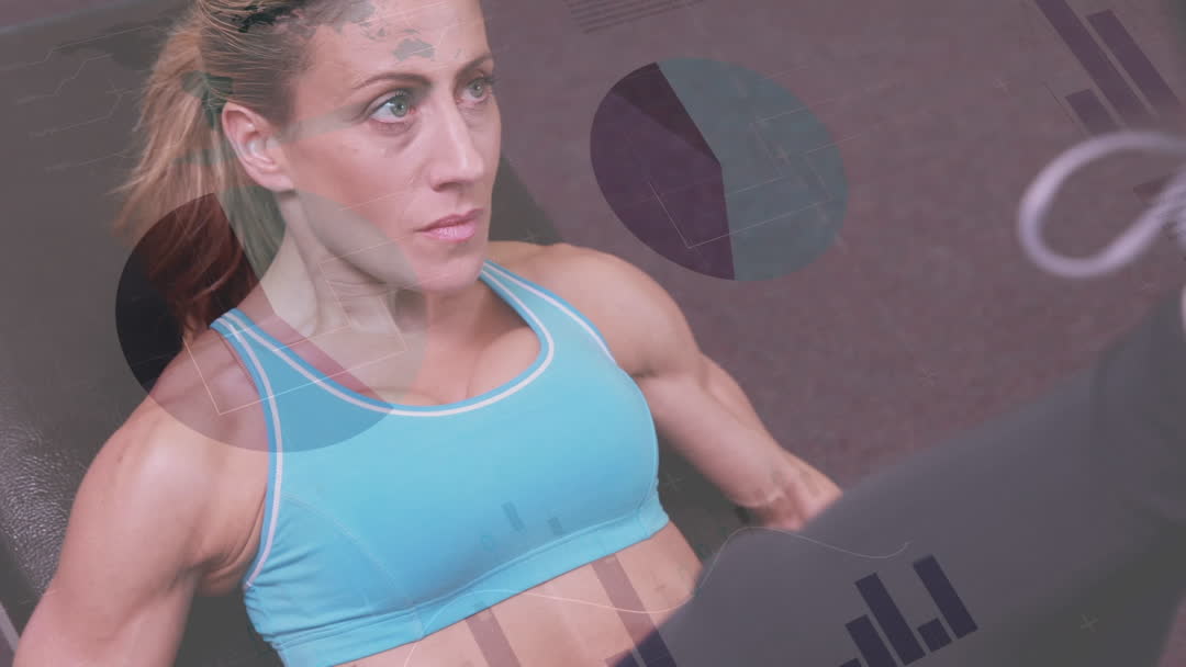 Female athlete working out, enhanced by digital data graphics, symbolizes integration of fitness and technology. Suitable for illustrating sports analytics, digital health topics, or modern gym promotions.