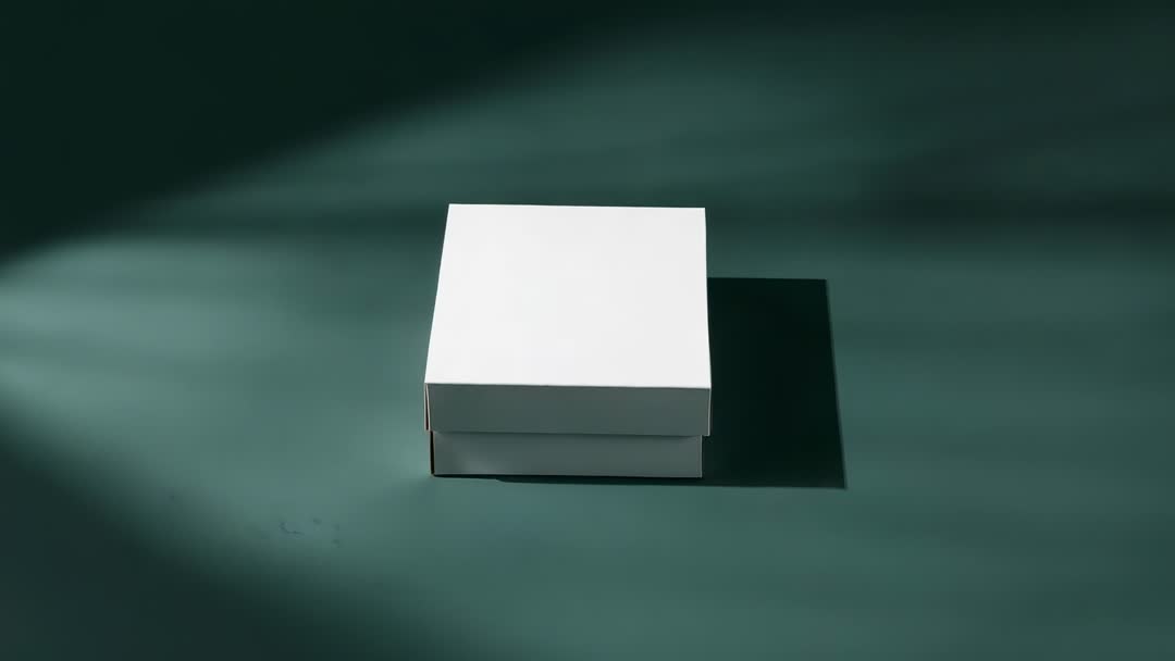 AI Generated Image. The spotlight highlights a white packaging box against a sleek dark green tabletop. This video is perfect for themes related to modern product showcase, elegant design presentations, or promotional graphics. Ideal for marketing focuses that emphasize simplicity, sophistication, and elegance of packaging designs.