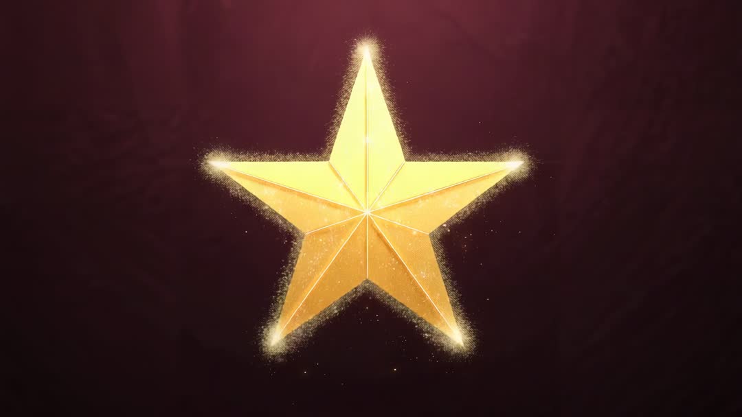 AI Generated Video. Spotlight intensifying, revealing gold faceted five-point star hovering center stage, emitting sparkling particles and soft halo glow against deep burgundy backdrop. Camera slowly zooming in while star rotating subtly and glitter dust drifting outward, creating cinematic, celebratory mood. Footage working well for award ceremony openers, event title sequences, product launch promos, holiday greetings, corporate milestone presentations, and social media reels. Motion graphic artists using clip for intro animations, lower thirds, logo reveals, website hero banners, and poster headers. Color palette favoring warm gold and deep red, offering luxury and glamorous feel with high contrast for overlaying text and logos. Recommended edits including slow crossfade, particle speed adjustment, and subtle lens flare to match brand tone.