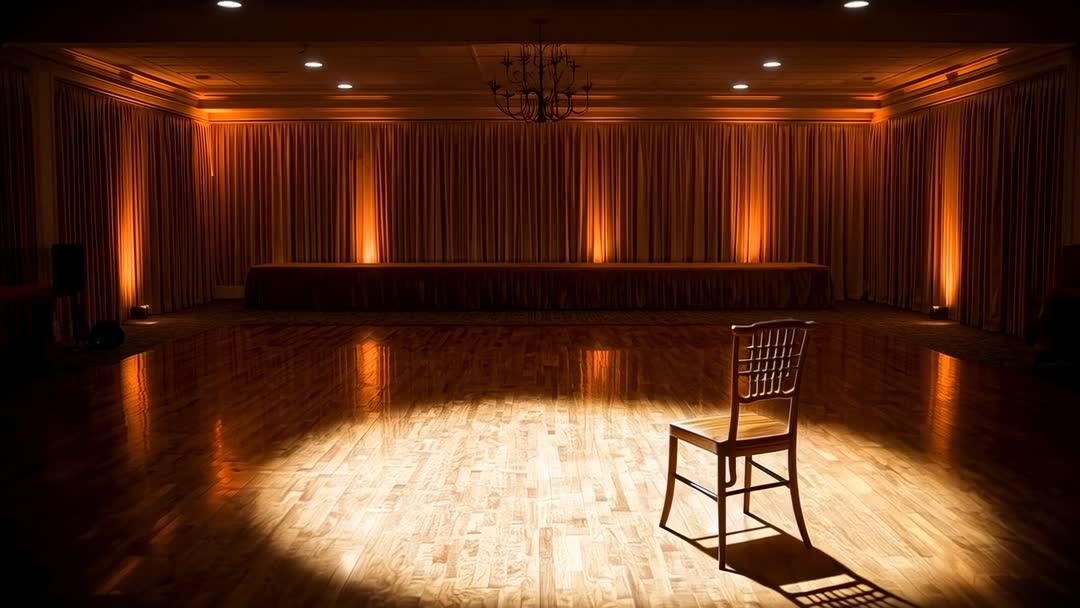 AI Generated Image. Scene showing single wooden chair sitting under focused warm spotlight on polished parquet floor inside dim ballroom lined with heavy curtains and chandelier. Spotlight casting long crisp shadow and glossy reflection across floor, conveying cinematic mood of solitude and anticipation. Wide negative space and central subject creating ample copy space for titles, logos, headlines, or on-screen text. Footage working well for lighting test reels, venue promotion, theatrical rehearsal montages, film title sequences, commercial backdrops, and editorial pieces about isolation or performance. Recommended uses include background for monologues, practice footage for gaffers and lighting designers, hero banner for event venue websites, social media video posts, and cinematic mood pieces. Color grading emphasizing warm amber tones and gentle vignette enhancing dramatic effect.