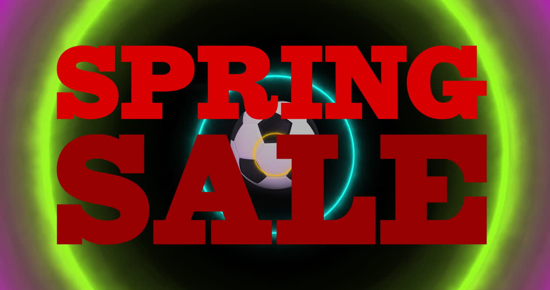 A vibrant animation featuring bold 'Spring Sale' text over a football background with dynamic, flashing neon lights capturing attention. Ideal for promoting sales events in sports stores, websites, or retail outlets. Used effectively in digital marketing campaigns to highlight seasonal discounts and attract customers.