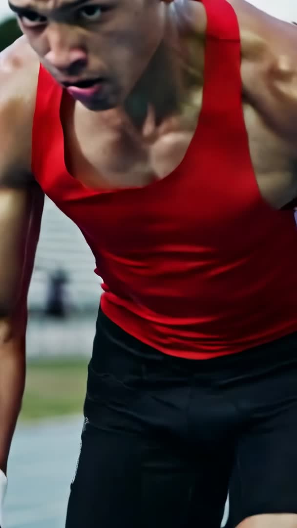 AI Generated Video. Vertical video showcasing sprinter launching from starting blocks after starter pistol, accelerating down track with explosive drive. Close-up framing highlighting muscular upper body, clenched jaw, intense focus, conveying determination and raw power. Serving sports promotion, athlete profile reels, training technique breakdowns, motivational short-form content, and broadcast openers. Ideal for mobile-first platforms and social media reels, delivering immediate impact for short-form advertising and event coverage. Editing suggestions: pairing with high-tempo soundtrack, using quick-cut edits, adding on-screen split times, or slowing to slow-motion replay for technique analysis.
