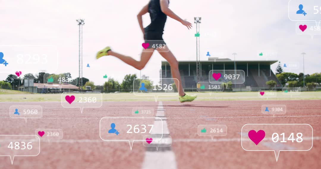 Male sprinter energetically sprinting on red track with social media icons representing digital engagement overlaying. This video illustrates the connection between athletics and social media, conveying concepts of promotion and reaching audiences. Useful for marketing, social media promotions, and athletic motivation content highlighting the fusion of sports and digital influence.
