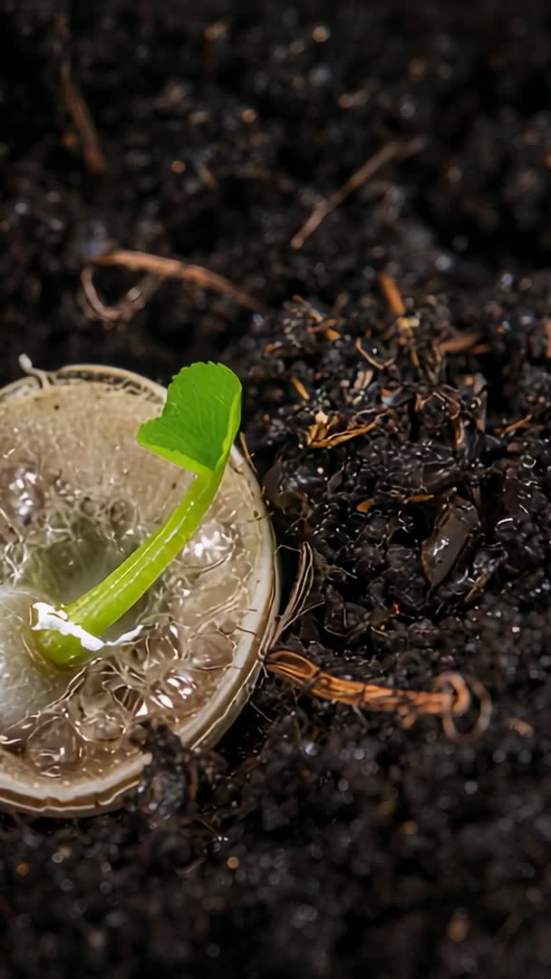 AI Generated Video. Closeup macro vertical video showing bright green sprout emerging from hydrogel disc nestled in dark potting soil. Frame focusing on radicle and cotyledon with moisture bubbles creating high-contrast detail and shallow depth of field for cinematic effect. Ideal for gardening tutorials, seed company promotions, environmental campaigns, educational content on plant biology, and social media shorts such as Instagram Reels or TikTok. Composition offering generous copy space for text overlay, logos, or lower third graphics. Suggested uses: opening clip for germination time-lapse, background for sustainable agriculture presentation, product ad for hydrogel or seed-starting kits, blog header for planting guides, or stock footage for science classrooms. Technical notes: vertical orientation, macro focus, shallow depth of field, natural color contrast, high magnification.