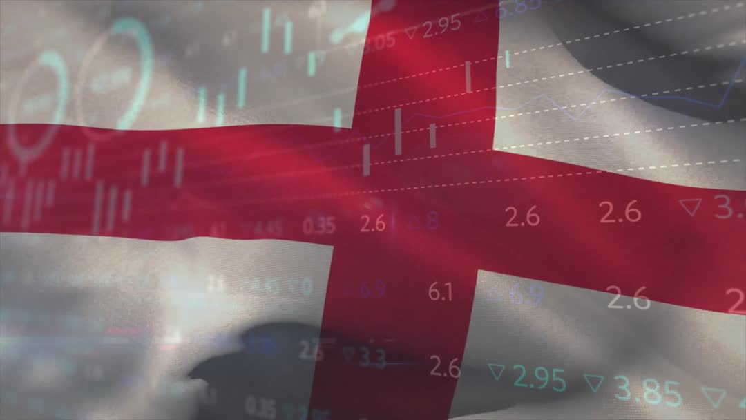 Patriotic theme with St George Cross intertwined with stock market data emphasizes Britain’s role in global finance. Useful for financial reports, presentations on economic trends, investment analyses, or digital artwork depicting British economy. Evokes sense of system businesses, data-oriented technologies, and stock investments, starting conversations on market strategies.