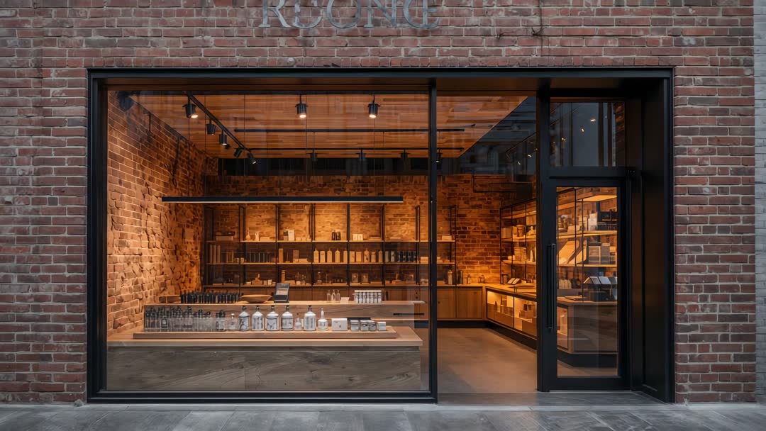 AI Generated Image. Stabilizing camera moving along sidewalk while filming warm-lit boutique through large glass window, showcasing wooden counter and rows of product bottles on open shelves against exposed brick walls. Composition featuring foreground display table, right-side glass door, and layered interior shelving creating depth for slow push-in or reveal shots. Footage providing cinematic, cozy atmosphere serving retail commercials, product launches, brand storytelling, interior design reels, storefront virtual tours. Suggested uses include hero clip for e-commerce landing pages, social media ads, promotional montage, b-roll for architecture and design portfolios, background loop for retail presentations. Color grading recommendation: enhance warm tones and soft contrast; crop for vertical formats for Instagram Reels or TikTok.