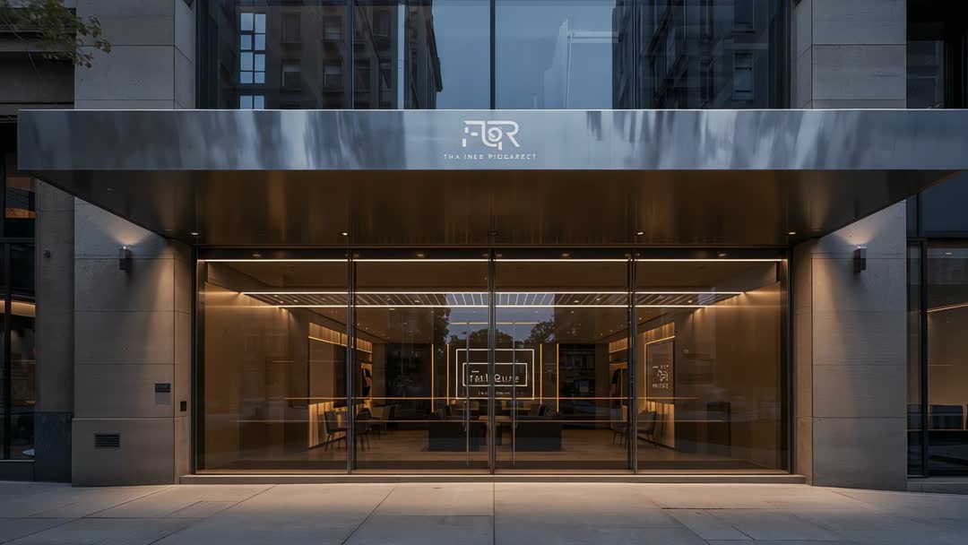 AI Generated Video. Showing stabilizing camera pulling back to reveal modern glass lobby with canopy and warm interior lighting. Useful for corporate video openers, real estate walkthroughs, hospitality promotions, architectural showcases, commercial property listings. Working well as background for landing pages, social media ads, investor presentations, TV commercials, hotel virtual tours. Mood conveying modern, sleek, welcoming entrance with reflective glass and soft evening glow. Frame allowing overlay of logo, lower-third text, call-to-action. Suggesting slow pullback timing, subtle camera easing, ambient music bed, warm color grading to enhance inviting atmosphere. Providing versatile clip for motion graphics, title sequences, website hero banners, stock video packages.