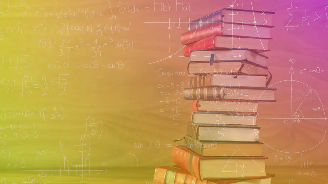 A colorful stack of books is overlaid with various mathematical formulas and diagrams, creating a dynamic and abstract visual. This video is ideal for educational content, promoting science and learning themes, or designing creative backgrounds for educational websites and materials.