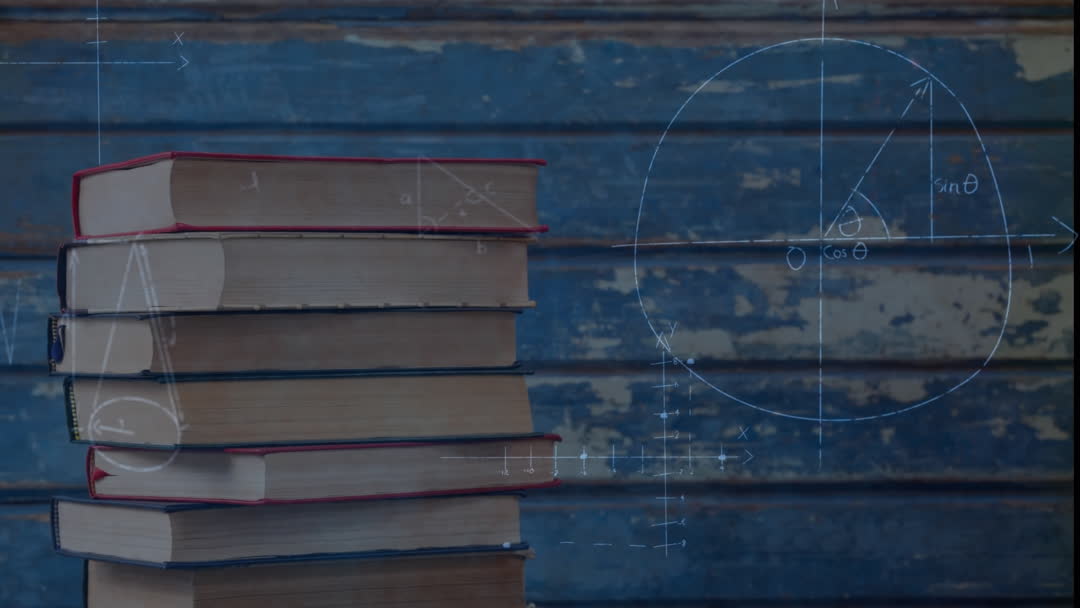 A stack of books is overlaid with animated technical drawings and mathematical formulas, evoking themes of education and engineering. This can be used for educational or scientific content, presentation slides related to academia, promoting math and science education, or illustrating technological concepts.