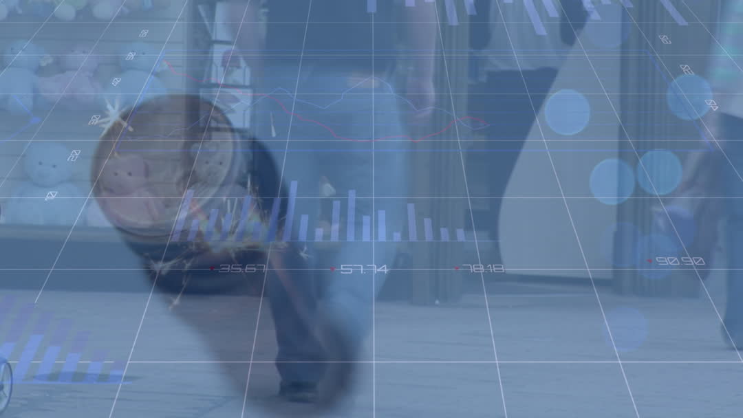 Overlay of coins and financial graphs on backdrop of business professionals walking in modern office conveys themes of finance, economy, and corporate activity. Ideal use for presentations related to financial analysis, investment opportunities, or economic trends. Suitable for illustrating the dynamism of the global market and business environments.