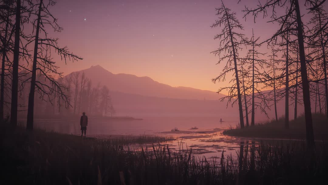 AI Generated Image. Video showing man standing on misty marsh shore while twilight deepening over lake and mountain peaks, silhouetted trees framing composition. Mood evoking solitude, reflection, calm, and quiet awe. Use for cinematic openers, meditation and mindfulness content, travel and nature promos, environmental storytelling, social media hero clips, website background loops, documentary B-roll, and music video interludes. Pair with slow push-in, gentle crossfade, or parallax zoom to enhance cinematic feel. Color grading suggestions: boost warm magenta-orange tones, keep low contrast in midground, preserve subtle star highlights. Audio suggestions: add ambient pads, soft piano, or natural water and wind ambiences to deepen mood. Ideal for brands promoting wellness, outdoor gear, travel experiences, mental health campaigns, and editorial storytelling.
