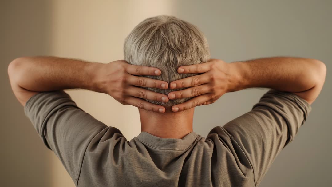 AI Generated Image. Video clip showing senior man standing with hands clasped behind head in neutral interior, back view. Scene conveying relaxation, contemplation, and quiet introspection, suitable for wellness, mental health, retirement lifestyle, stress management, and mindful living topics. Use for website banners, social media ads, blog headers, video backgrounds, corporate wellness presentations, healthcare campaigns focusing on elder wellbeing. Lighting and neutral tones allowing easy color grading and text overlay. Ideal for transitions, calming sequences, and stock compilations highlighting aging gracefully and self care.