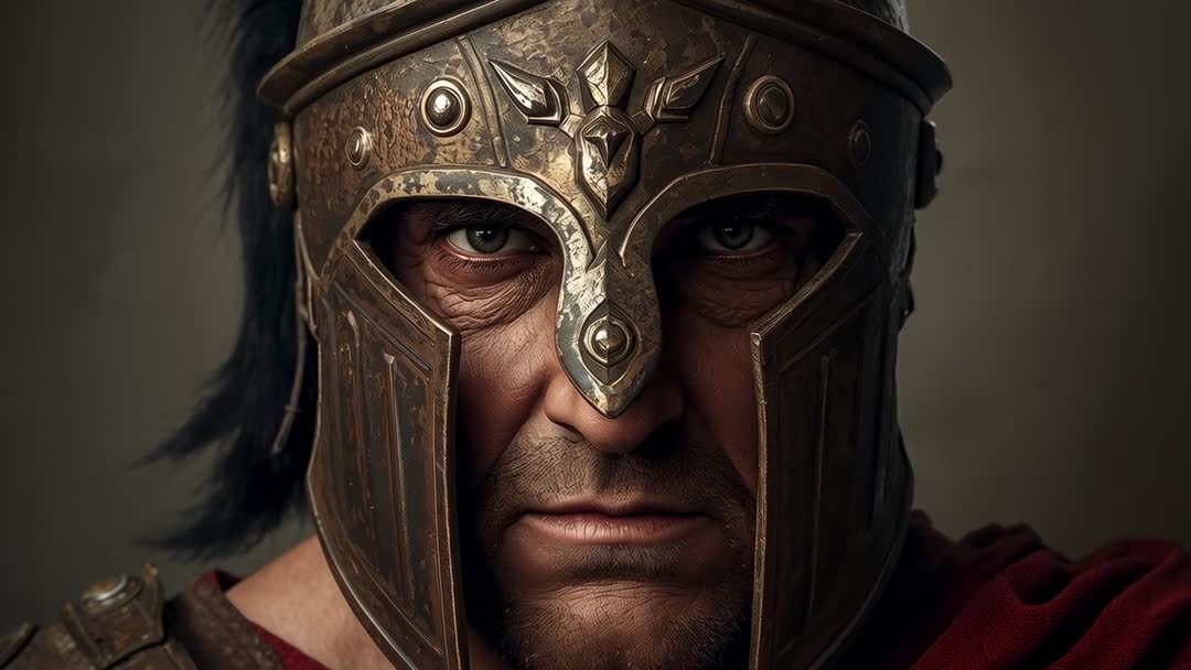 - Staring Ancient Warrior Wearing Bronze Helmet and Red Cloak — Cinematic Close-Up Video