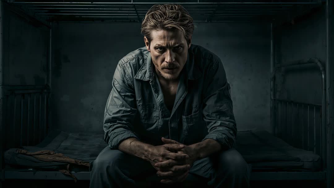 AI Generated Image. Video showing lone male detainee sitting on metal bunk, clasping hands and staring into camera with intense, unflinching gaze. Low-key lighting creating deep shadows and moody atmosphere, worn shirt sleeves rolled and thin mattress reinforcing sense of confinement and rough conditions. Visual language conveying tension, isolation, psychological strain and inner conflict; facial expression and body language highlighting inner turmoil. Useful for film trailer, crime drama scene, suspense sequence, documentary on incarceration, social justice campaign, mental health awareness piece, legal commentary, book cover or podcast intro. Editing suggestions include slow push-in, desaturated color grading, ambient drone sound and tense score for dramatic impact. Cropping options include tight medium shot for character study and wider frame for environment context. Footage being AI-generated, verify usage rights and ensure model release for commercial distribution.