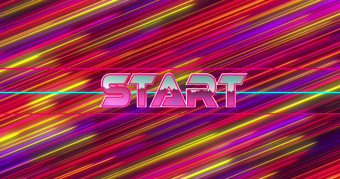 Design featuring word 'Start' in bold neon over vibrant and colorful light trails pattern. Perfect for video games, entertainment graphics, digital marketing, retro-style presentations, or technology-focused projects.