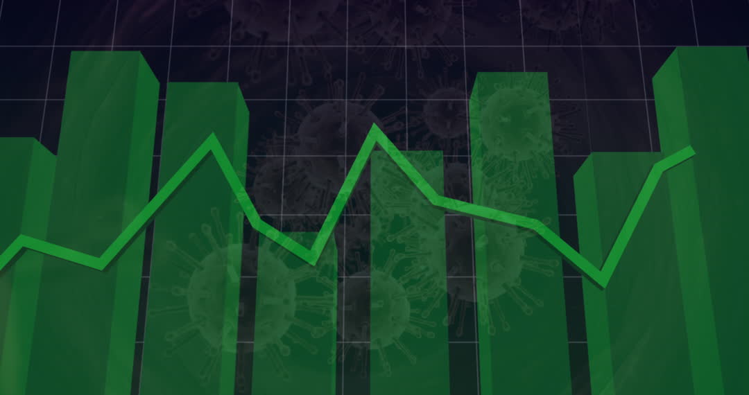 Visualization combines green graphs and virus patterns, illustrating economic impact of COVID-19 and efforts towards recovery. Useful for materials focusing on pandemic analytics and economic forecasting.
