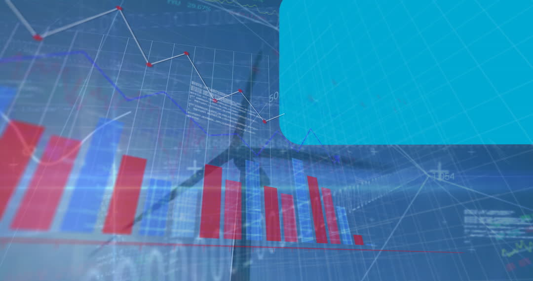 Digital blending of statistical data graphs with wind turbine. Highlighting business technology in sustainable energy sector. Suitable for visuals in tech, finance, energy presentations, and corporate content.