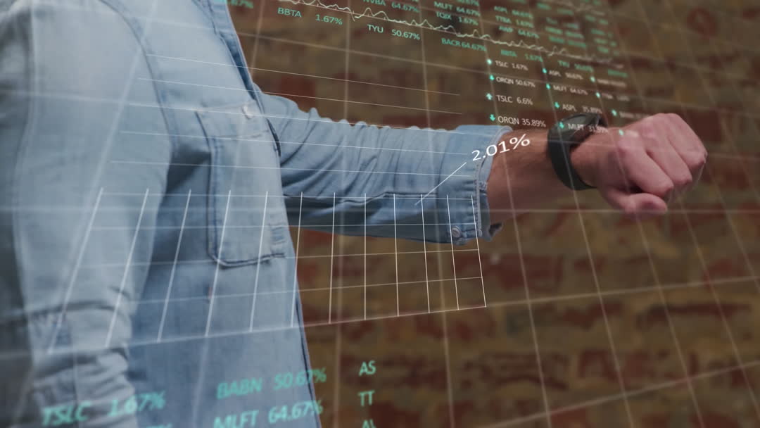 A modern scene featuring data overlays of stock market statistics on a person using a smartwatch. Suitable for illustrating concepts related to business technology, financial analytics, and innovative digital solutions in futuristic settings. Ideal for use in presentations, marketing materials, or articles discussing the intersection of technology and finance.