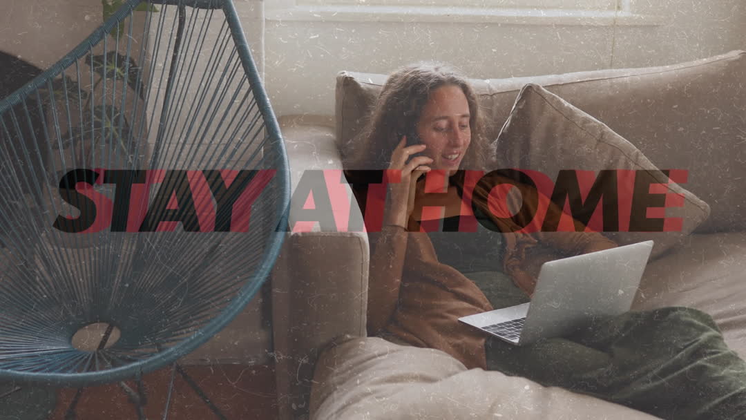 Caucasian woman on sofa, multitasking with smartphone and laptop, promotes staying safe at home. Stay at home text conveys message about Covid-19 safety measures through animation. Perfect for blogs or social media campaigns focusing on pandemic-related topics, public safety announcements, or home office and remote work lifestyle promotions.