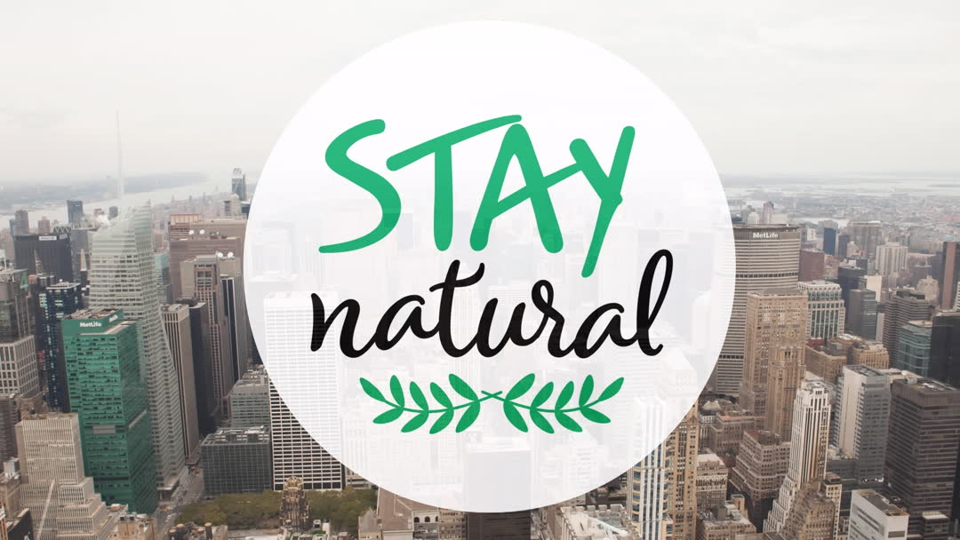 This design features an animated 'Stay Natural' message superimposed on a cityscape in New York. The contrasts of nature-focused messaging against a modern, bustling urban environment picture promote eco-consciousness and sustainability. This visual is ideal for campaigns or educational content advocating green businesses or lifestyle choices in metropolitan areas.