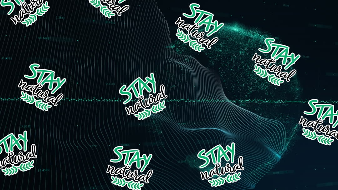 This digital art features cascading 'Stay Natural' text against dynamic shapes and atmospheric elements. Perfect for use in social media campaigns, eco-friendly or environmental themes, or as a digital backdrop in modern design projects. Its green and futuristic motif appeals to both contemporary and environmental aesthetics.