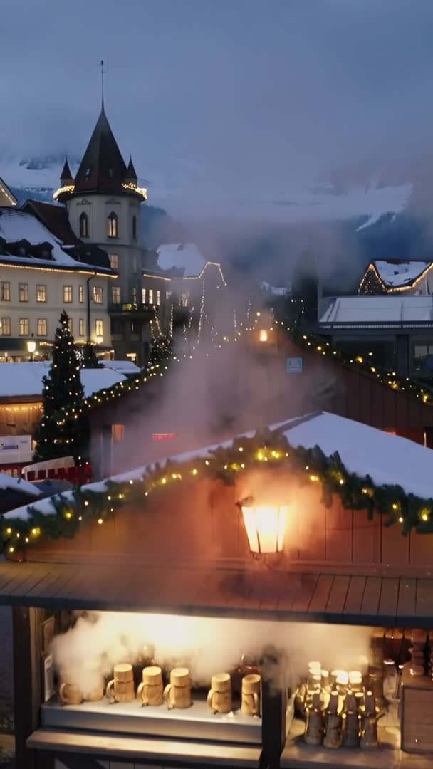 AI Generated Video. Vertical video showing steam drifting from vent and swirling around lantern at dusk in cozy alpine holiday market. Warm lights and garlands outlining wooden stalls, snow-dusted rooftops adding seasonal charm. Foreground featuring steaming mugs and bottled drinks on vendor counter, suggesting hot drink service and mulled wine. Atmosphere conveying festive, cozy, cinematic winter evening with soft bokeh lights and gentle smoke. Ideal for social media reels, Instagram stories, vertical ads, travel and tourism promotion, seasonal event marketing, and holiday greeting content. Useful for background footage in seasonal commercials, recipe videos for mulled wine and hot cocoa, blog headers, posters, and mobile app hero banners. Offering vertical aspect ratio optimized for mobile devices and easy-to-edit clip for color grading and slow-motion effects.