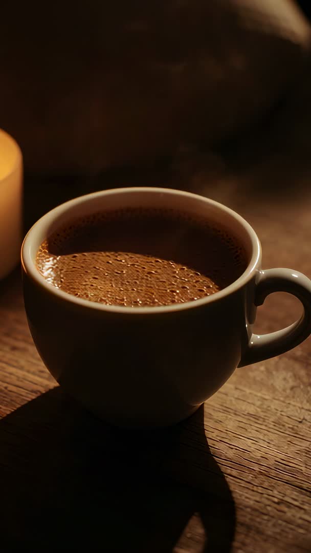 AI Generated Video. Showing steaming ceramic cup of coffee resting on rustic wooden table beside glowing candle. Bathing scene in warm golden light, creating soft shadows and textured wood grain. Focusing on frothy surface and rising steam with shallow depth of field, delivering intimate, cozy mood. Framed vertically (9:16) for social media reels, TikTok, Instagram Stories, and mobile ads. Working well for cafe promos, morning routine clips, product showcase for mugs, lifestyle websites, and relaxation montages. Looping-friendly short clip for background use in menus, blogs, or video intros; leaving room for overlay text and gentle ambient music.