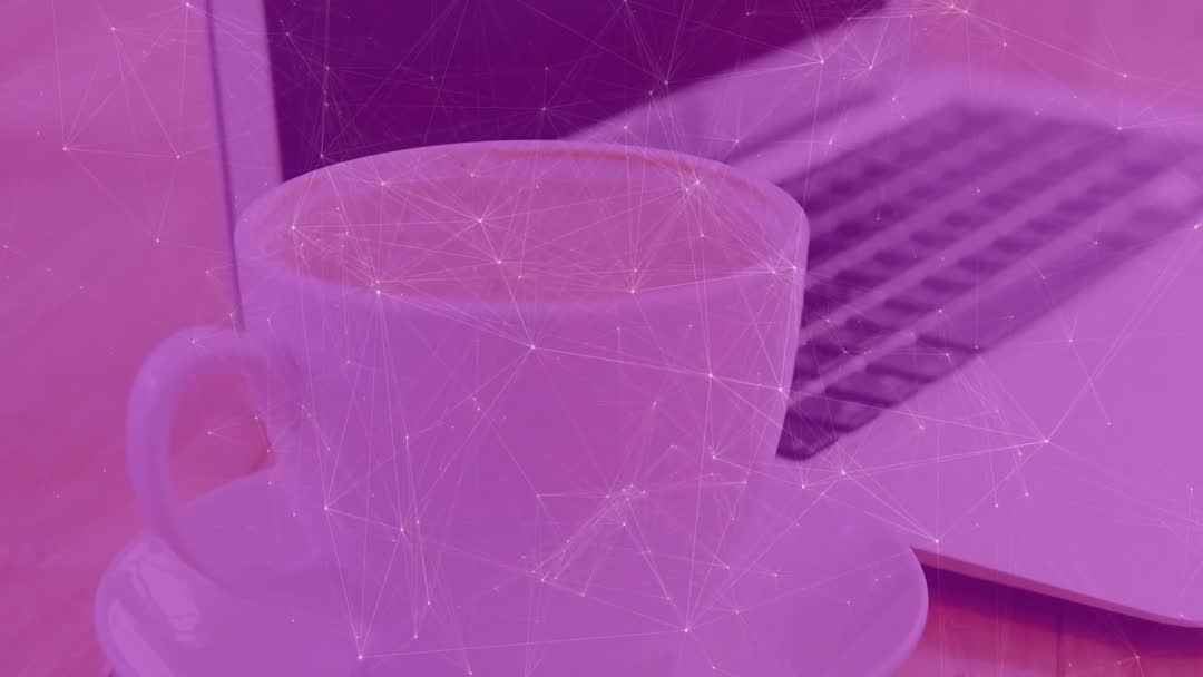 This video features a steaming white coffee cup on a saucer alongside a laptop, overlaid with a digital network pattern. The blend of a comforting coffee break with the hint of advanced technology suggests a modern workspace atmosphere. Perfect for representing subjects related to technology integration, innovation in the office, digital productivity, or minimalist design inspirations in promotional materials or 'work from home' articles.