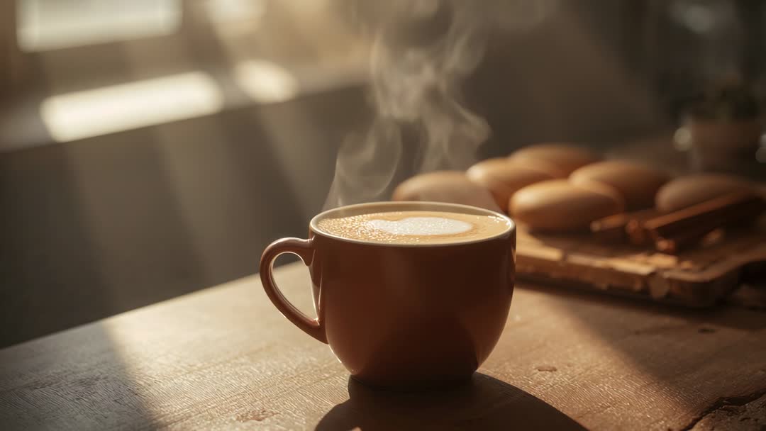 AI Generated Image. Video showing steaming latte in ceramic mug on sunlit wooden table, steam rising in slow curls and latte art forming delicate foam pattern. Sunlight rays streaming through window, creating warm golden bokeh and long soft shadows. Featuring fresh rolls on wooden board in background, adding breakfast and bakery context. Lighting and composition creating cozy, rustic mood suitable for lifestyle and hospitality projects. Footage working well for cafe promotion, social media reels, website hero backgrounds, recipe video openers, product ads, and slow-living content. Clip lending itself to looping, gentle slow motion, and soft zooms to enhance calm morning atmosphere. Color grading leaning warm to amplify inviting tone and brand storytelling.
