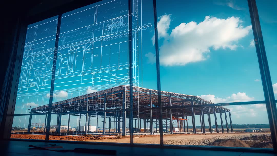 AI Generated Image. This video features a seamless transition where a detailed blueprint overlay reveals a large steel frame structure visible outside a window. Dusty ground surrounds the site under a partly cloudy sky, adding realism. It beautifully merges the conceptual architectural planning phase with the reality of the construction process. Ideal for content in architectural visualizations, construction project showcases, urban planning presentations, and engineering education materials.