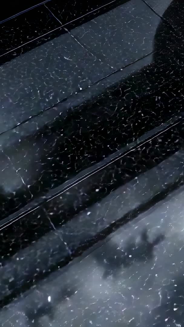 - Stepping reflection on glossy black marble tiles vertical video for moody lobby scenes