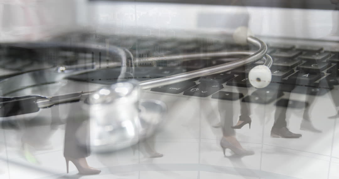 - Stethoscope on Keyboard with Overlapping Business People Silhouettes