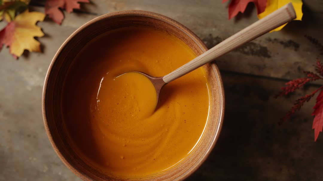 AI Generated Image. Showing wooden spoon stirring glossy creamy pumpkin soup into spiral in ceramic bowl on rustic tabletop with scattered autumn leaves. Capturing warm orange tones and smooth texture for cozy fall mood. Working well for recipe videos, cooking tutorials, social media reels, food advertisements, Thanksgiving menus, blog headers, and seasonal marketing. Leaving space near frame edges for overlay text, logo, or lower-third graphics; suitable for looping slow-motion clips and close-up product shots. Suggesting warm color grading, soft ambient soundtrack, and minimal text to enhance comforting harvest atmosphere.