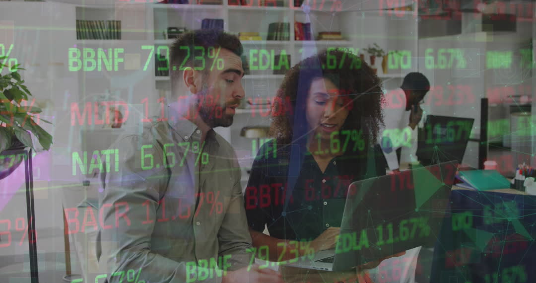 Two professionals, a man and a woman, engage in a collaborative discussion in a modern office setting. The backdrop displays a myriad of fluctuating stock market indices, suggesting dynamic business and financial analysis. This scene embodies themes of economic strategy, teamwork, diversity, and technological expertise. Ideal for use in articles about business collaborations, finance, stock investments, global economy talks, technology-driven enterprise discussions, and professional team building.