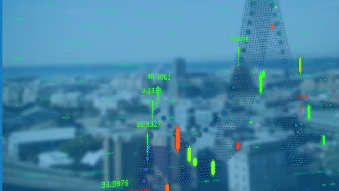 Visual represents digital financial data overlaying urban cityscape. Provides conceptual insight into how large-scale economic trends and stock activities influence urban environments. Useful for presentations or content related to financial market analysis, economy, trading strategies, technological impact on finance, and urban development.