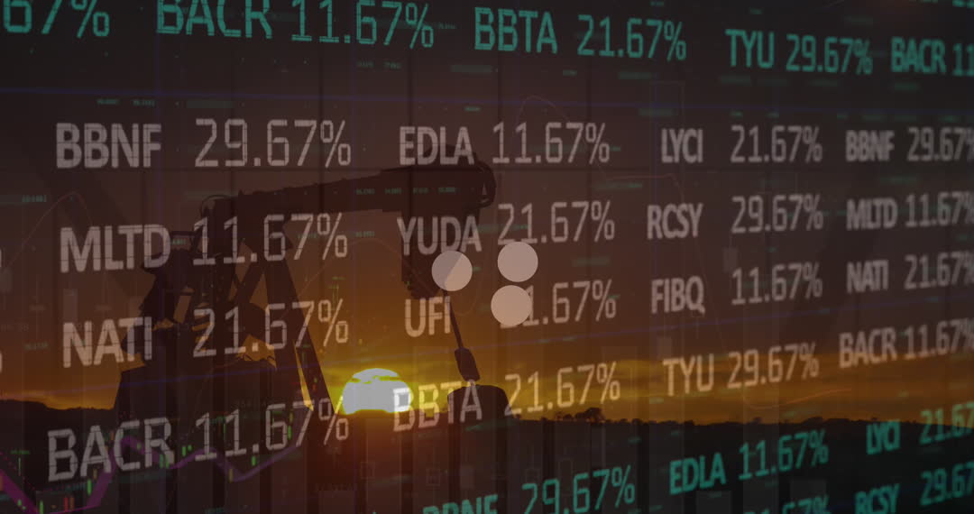 Stock market data animation with a silhouette of a crane against a sunset background collating themes of modern finance and industry. Useful for presentations on global economic trends, finance seminars, and reports focusing on industrial impacts on market fluctuations.