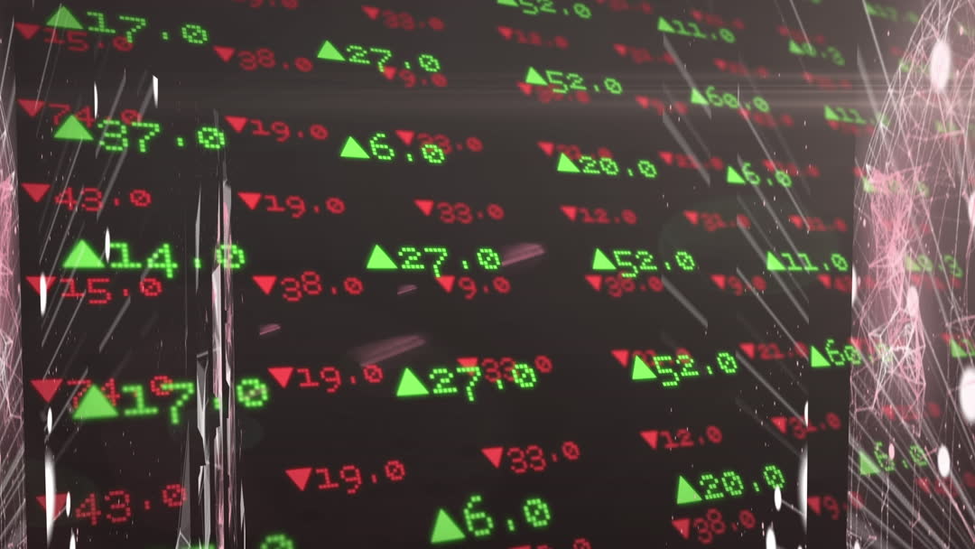 This visualization showcases animated graphic representation of stock market data, using red and green numbers to depict fluctuations in trading figures. Ideal for illustrating themes on financial analysis, global economy dynamics, business illustrations, or digital finance tools in presentations and media projects.