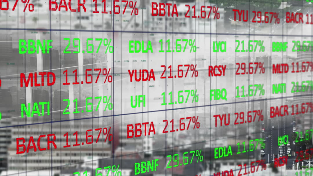 Digitally rendered graphic showing vibrant stock tickers superimposed over a city skyline. Useful for illustrating concepts related to finance, stock trading, economic forecasting, and urban technology integration. Suitable for use on financial news websites, investment blogs, or tech company presentations.