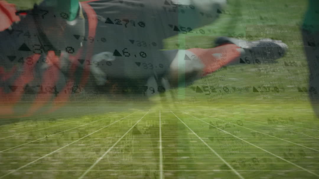 Energetic blend of competitive sports action with complex financial data suggests diversified investment strategies, enhances presentations on global economic growth in sports sector, and videory appealing for themes of resilience and strategic movement in business.