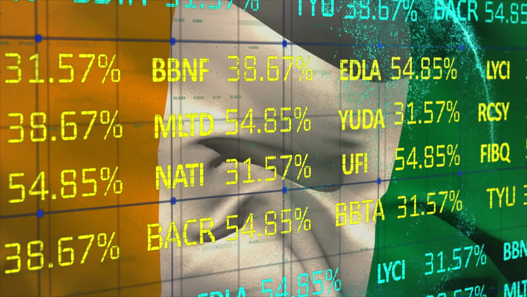 Visual represents convergence of global economy and technology through animated stock market data layered over Ivory Coast flag. Useful for presentations, financial analysis videos, education on market trends, and multinational business strategies.