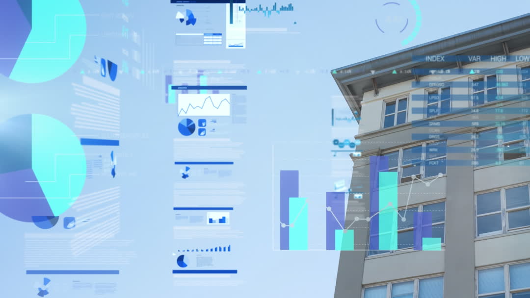 Animations of graphs and trading data overlay modern building against a clear sky. This depiction of financial growth and business dynamics illustrates themes of stock market activity and economic trends. Useful for representing financial success, business reports, corporate performance, and analytical presentations.