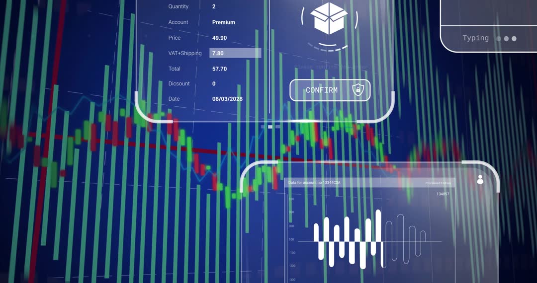 Illustrates complex financial concepts with visuals suitable for presentations on economics and stock market analysis. Ideal for use in articles about finance technology trends, investment strategy guides, or economic reports showing real-time data interfaces and trade metrics.
