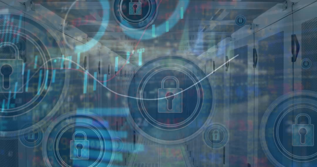 Dynamic and modern visual showing digital interface with stock market graphs and security icons layered over a server room background. Perfect for illustrating financial technology news, data analytics report themes, cybersecurity in financial sectors, or introducing web and app interfaces focused on business networking.