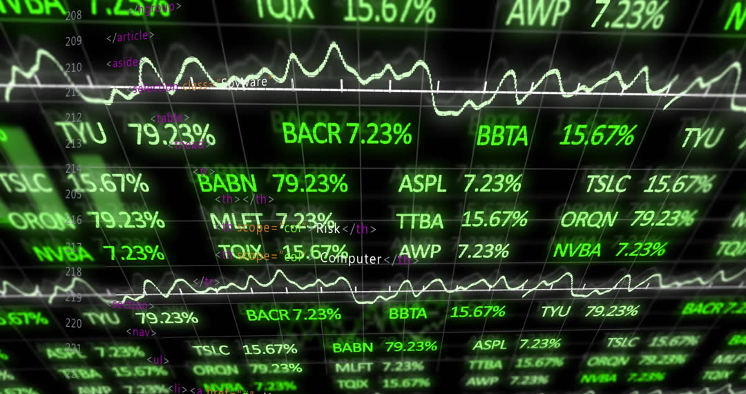 Green illuminated stock ticker symbols and fluctuating graphs illustrate dynamic financial data, ideal for presentations on investments, economic trends, or business strategy meetings, as well as use in financial journalism or educational materials.