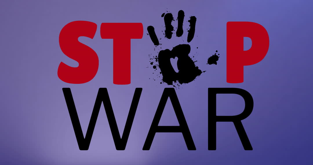 Features bold red and black lettering with a handprint symbol emphasizing the message 'Stop'. Perfect for use in anti-war campaigns, peaceful protests, awareness raising on social media, educational materials regarding violence prevention and promoting global awareness efforts.