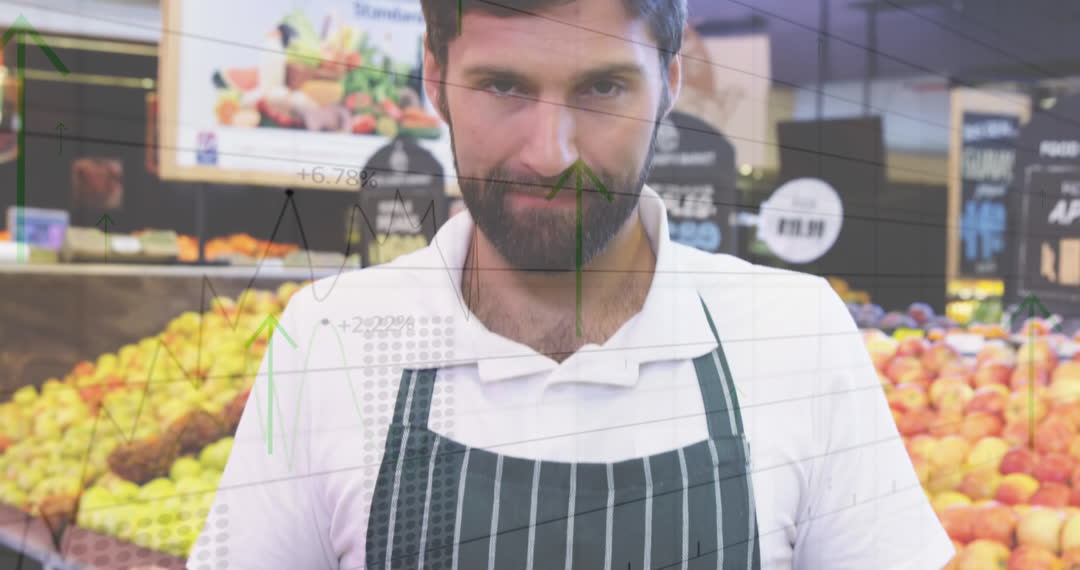 This depiction of a shop assistant in a grocery store has an overlay of financial charts and data. The mixed reality concept here highlights global food market trends, economic analysis, and business strategies. Ideal for articles on grocery industry economics, business strategy presentations, or marketing materials promoting data analysis tools in retail settings.