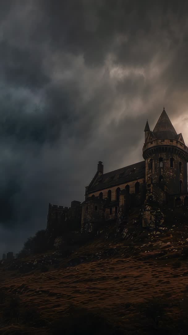 AI Generated Image. Showing medieval stone castle perched on windswept hillside under rolling storm clouds, dramatic light slicing across turrets. Capturing moody, cinematic atmosphere with deep shadows and ominous sky, offering large negative space for titles and text. Working well for horror trailers, fantasy intros, historical documentaries, travel promos, book covers, website hero headers, seasonal Halloween campaigns, and social reels. Vertical 9:16 format matching mobile and social platforms, enabling immersive portrait storytelling. Using slow upward pan, subtle zoom, or reveal transition to enhance suspense and sense of scale. Using color grading toward desaturated blues with warm highlights on stone to heighten contrast and mood.