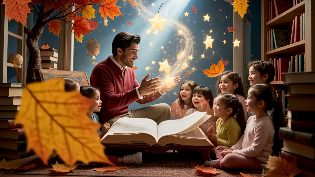 - Storyteller reading to children in cozy autumn library nook while magic stars swirl